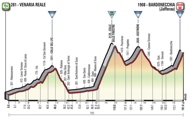 - 19ª etapa (viernes 25 mayo): Venaria Reale – Bardonecchia / Jafferau (181 km) -> mapa