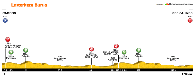 Trofeo Campos – Porreres – Felanitx – Ses Salines, 176 km (Jueves 25 de enero). Info en la web / Rutómetro / Perfil oficial / Mapa interactivo