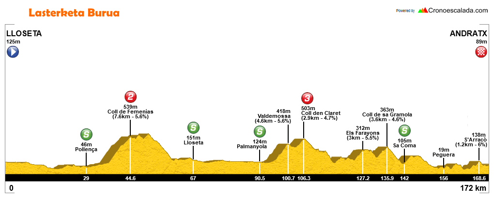 Trofeo Lloseta – Andratx, 171,9 km (Sábado 27 de enero). Info en la web / Rutómetro / Perfil oficial / Mapa interactivo