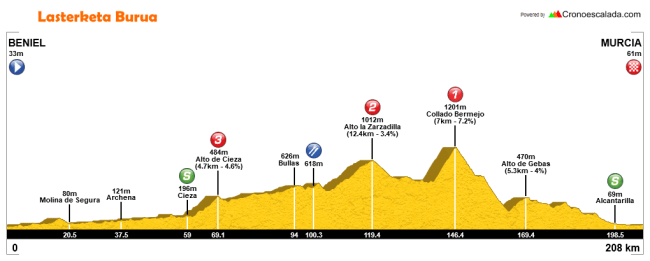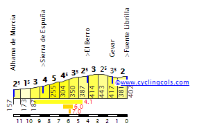 Terminado el descenso, en las cercanías de la población de Alhama, se girará hacia el norte poco para afrontar la subida al Alto de Gebas -> perfil (desde cruce Sierra Espuña), con casi 6 km de pendientes muy modestas, incluyendo sólo un tramo de cierta dureza, con un km central al 6%, pero que si la carrera llegue rota tras el puerto previo puede hacer daño, coronándose oficialmente a 38 km de la llegada en Murcia.
