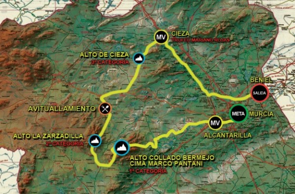 Como decíamos al inicio, la prueba comenzará en el municipio de Beniel, en la comarca de la Huerta de Murcia, al este de la Comunidad, con unos primeros 60 km básicamente llanos en busca de la localidad de Cieza, con meta volante incluída, homenajeando a Mariano Rojas, y donde tras girar hacia el suroeste comenzará la subida al Alto de Cieza, en la Sierra del Oro, con algo más de 8 km al 3,5% de media, destacando un km al 6% cerca de la cima, aunque en general es un puerto muy tendido.