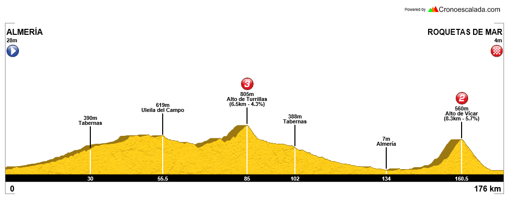 A partir de ahí se gira hacia el oeste, con el terreno volviendo a tener perfil ascendente en busca de Lucainena de las Torres y el encadenado de la cota homónima, Sierra Alhamilla y Alto de Turrillas, marcado como 3 cotas distintas aunque en realidad se podría considerar un único puerto, con unas cifras totales de casi 8 km al 4% de media (4,3 km al 5,2% si no se cuentan los 2 primeros repechos), coronándose oficialmente en el km 92,5 de la ruta, justo a mitad de la prueba