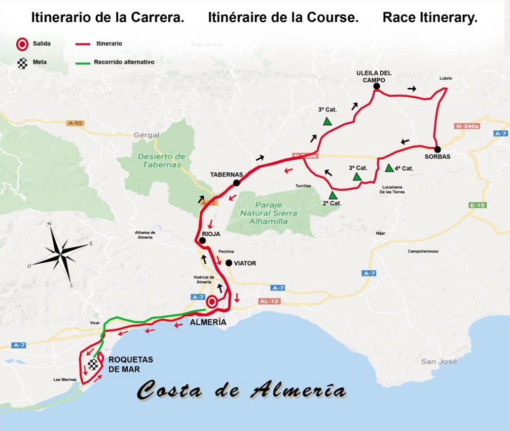 La parte inicial de la ruta, dirigiéndose primero hacia el norte y luego hacia es este, pica hacia arriba, destacando el sprint intermedio en la localidad de Tabernas y el repecho de Cuesta Blanca, marcado de 3ª aunque es muy tendido. Superada esta cota se entra en una zona de falsos llanos, con paso incluído por los municipios de Uleila del Campo, donde está el 2º sprint intermedio, y Sorbas, poco después del km 70 de la carrera.