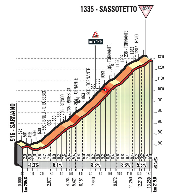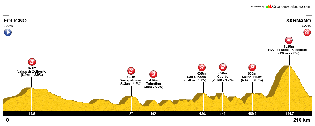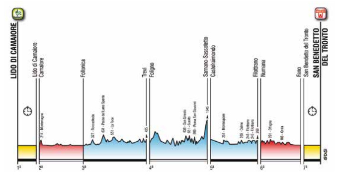 El sábado, turno para la etapa reina, que combina larga distancia, 220 km, con un perfil «serrucho» en la parte central de la ruta, plagada de pequeños puertos y repechos, destacando Gualdo (2,5 km al 9,2%) y Penna San Giovanni (2 km iniciales al 10,5%), antes de la dura subida final a la estación de esquí de Sassotetto, en pleno Válico di Santa Maria Maddalena, junto a la localidad de Sarnano. Aunque el puerto ya se ha subido en varias etapas, la más recordada Camerino 2009, se trata de su estreno como llegada, si bien al terminar en la estación pierde el tramo final, teniendo de todos modos unas cifras muy serias: 11 km al 7,5% de media (sin contar el falso llano inicial), con el tramo más duro a 4,5 km de meta, aflojando en los últimos km. En definitiva, una jornada muy exigente, donde si bien lo más probable es que la batalla entre los favoritos quede reducida a Sassotetto, el desgaste previo se dejará notar, pudiendo haber diferencias importantes en meta. Y ojo a la posibilidad de fuga bidón si hay una escapada numerosa y el equipo del líder no es capaz de controlar.