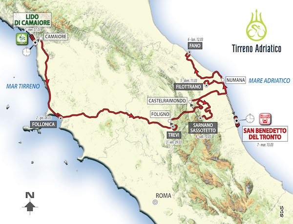 Del 7 al 13 de marzo, coincidiendo con la disputa de la París-Niza, se celebra la 53ª edición de la Tirreno Adriático, la segunda prueba por etapas más importante de todas las que se celebran en el país transalpino, sólo superada por el propio Giro de Italia, y una de las carreras de una semana con mayor relevancia y prestigio de toda la temporada.