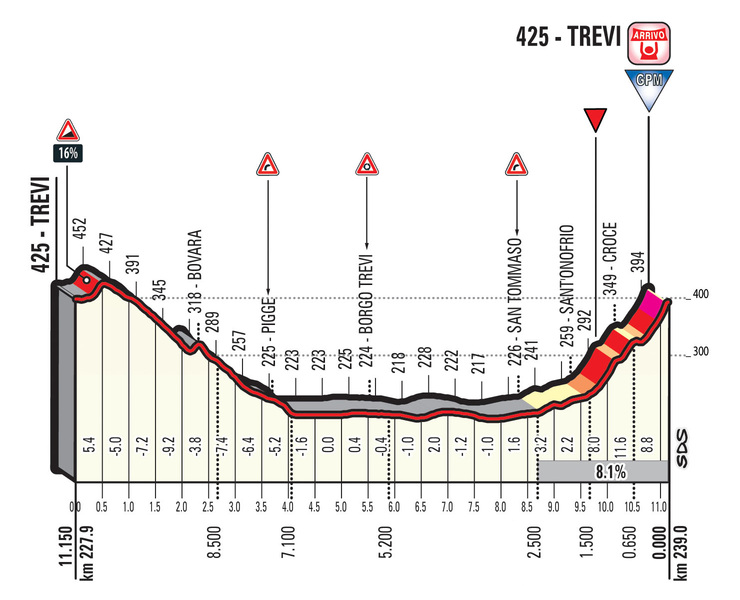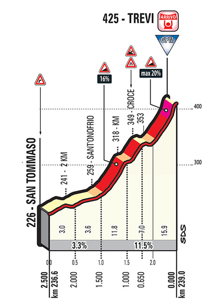 - Trevi -cota superior- (km 228,4): 452 m – 3 km – 7,5 %