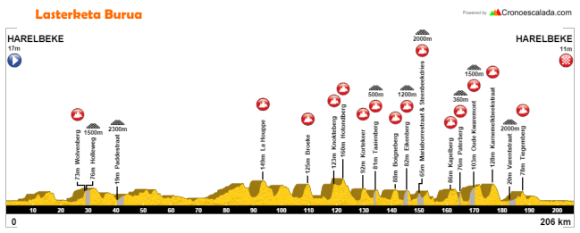 Aunque el desarrollo de la carrera es imprevisible, pudiendo pasar cosas importantes en cualquier instante, ya sea por ataques lejanos, aprovechando la estupenda sucesión de cotas, o caídas, que ya han marcado varias ediciones en los últimos años, a priori el momento clave llegará en los 50 km finales, con el Kapelberg, de 1,3 km al 7% y máximas del 14% (aunque según el rutómetro sería bastante más blando), justo antes del encadenado de Paterberg -> imágenes, y Oude Kwaremont -> imágenes: el 1º de ellos “corto pero matón”, con 360 m a más del 12% de media y puntas que llegan al 20%, formando parte de la lista de rampas máximas en carrera; y el viejo Kwaremont, más tendido pero mucho más largo, con 2,2 km al 4,2% y máximas del 11%. Estos 2 muros, ambos de pavé, son también las ascensiones claves del Tour de Flandes desde el cambio de recorrido de 2012, aunque colocados en el orden inverso, con Kwaremont situado delante del Pateberg.
