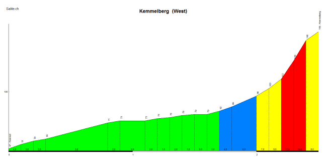 La vert. oeste del Kemmelberg, con medio km final al 12% y puntas del 23%. Perfil D.Gobert / Salite.ch