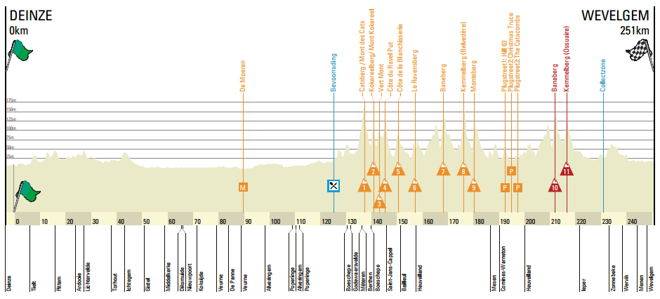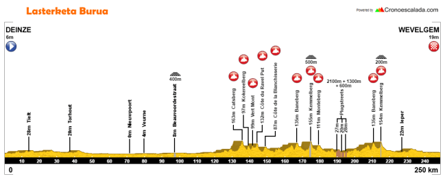 Terminado el descenso, corto pero revirado y por una carretera muy estrecha, quedarán poco más de 30 km para la línea de meta, ya básicamente llanos y totalmente asfaltados, con la tradicional llegada en Wevelgem, en la avenida de Vanackere, para un total de 251 km de recorrido (mas los casi 4 neutralizados), la distancia más elevada de los últimos años, acercándose bastante al kilometraje de los Monumentos, lo que favorece a los corredores de fondo.