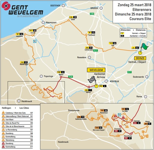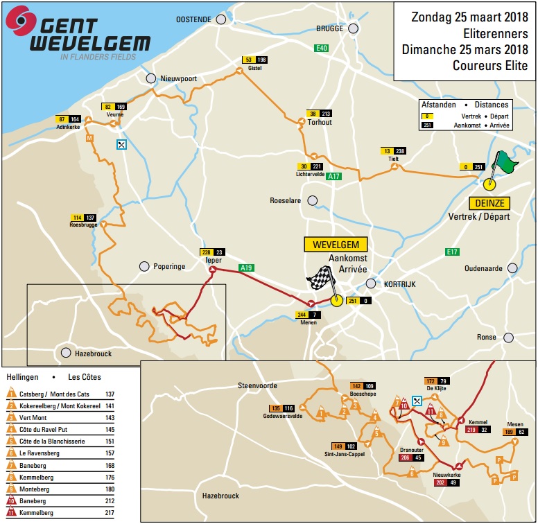 El recorrido de este año es muy similar al de 2017, cambiando sólo algunos tramos de la 1ª mitad de la ruta, pasando por las localidades de Torhout y Gistel en lugar de Diksmuide y Lo-Reninge, para a partir de Roesbrugge, en el km 111 de carrera, seguir ya el trazado de la última edición, repitiendo de hecho todas las cotas y en el mismo orden, así como los mencionados “Plugstreets“, 3 tramos de tierra seguidos en torno al km 195 de la ruta, sumando en total 4 km sobre esta superficie -> vídeo presentación / reconocimiento de los tramos. Aunque los 3 están en buen estado, su estrechez puede provocar cortes en el grupo, especialmente si sopla viento de costado, al ser caminos muy expuestos.
