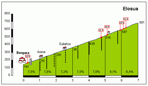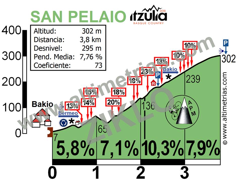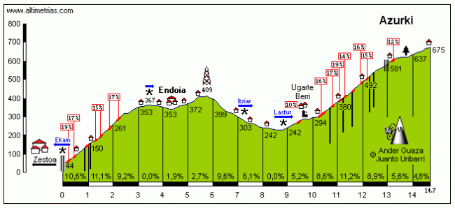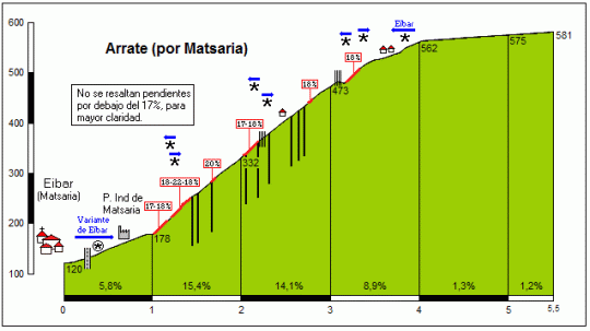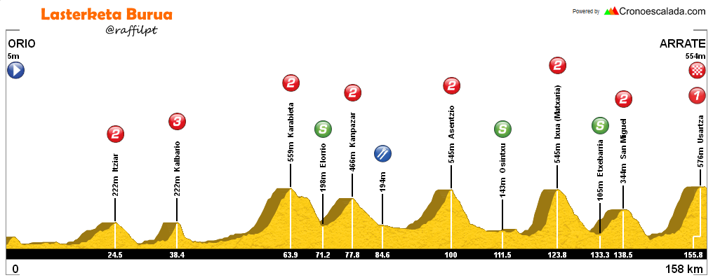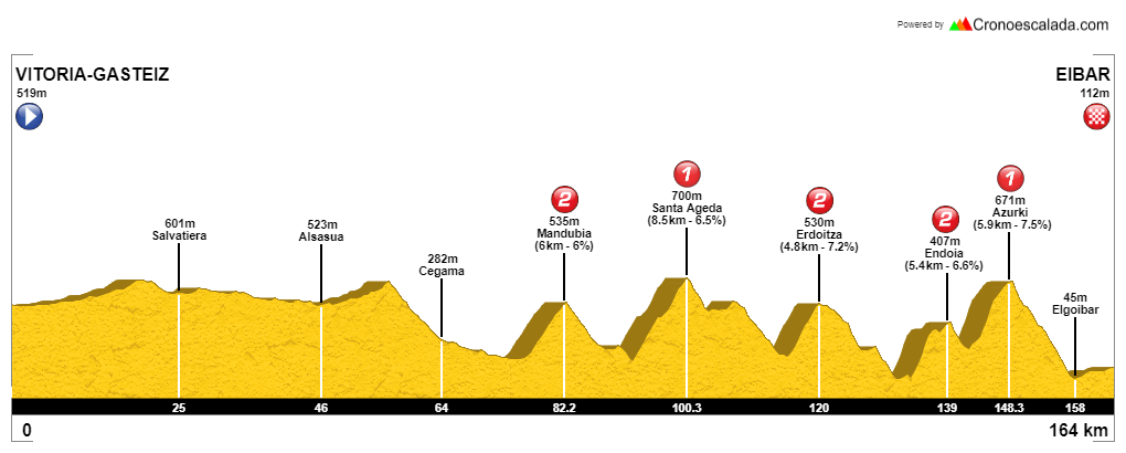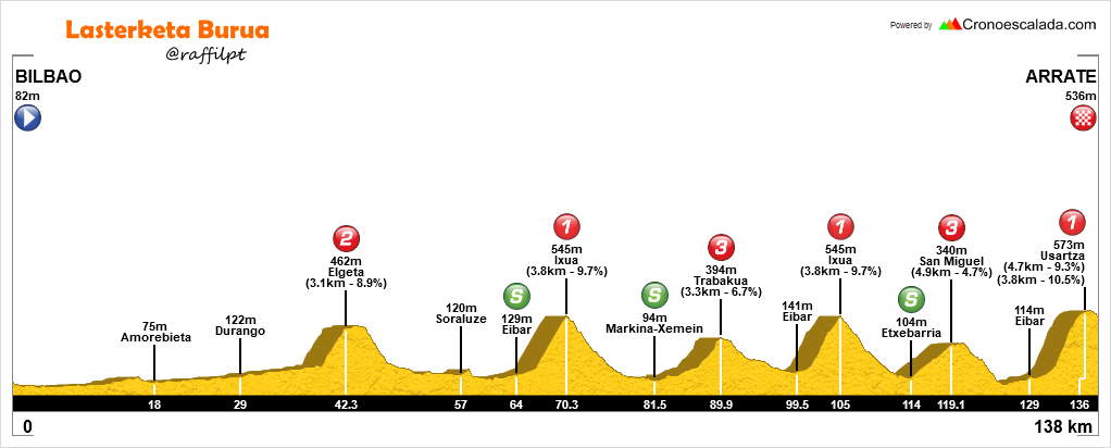 Y es que las dos últimas jornadas son de montaña, empezando con una etapa de 165 km entre Vitoria-Gasteiz, la capital de Álava, y Éibar, de regreso en Guipúzkoa, que incluye en los 70 km finales el puerto de Elosua–Gorla, con 7 km a casi el 8%, precediendo al duro encadenado de Endoia + Azurki, el primero con 3 km iniciales al 10,5% y rampas de hasta el 19%, y el segundo con 3 km centrales al 10% de media, coronándose a 20 km de meta, la mitad de ellos de rápido descenso (aunque con un repecho intercalado tras el cambio de vía en la cima de Azkarate), pero los últimos 9 básicamente llanos, pudiendo verse bonitas persecuciones. Y como despedida, la etapa reina, de sólo 122 km pero incluyendo 8 puertos, los 4 primeros, Trabakua, Gontzagarai, Balcón de Bizkaia y Muniketa, muy seguidos, para tras una zona más sencilla afrontar Elgeta, con 3 km a casi el 9%, y un rodeo llano previo a Éibar, comenzando ahí el bucle con Ixua, con 4 km a más del 9%, y el tendido San Miguel, con 5,5 km al 4,5%, antes de subir Arrate por Matsaria, que destaca por sus 2 km centrales al 15%, en el top-20 de km más duros en carrera, y rampas de hasta el 22%, con un tramo hormigonado y uniéndose con la vertiente clásica antes de Usartza, con un corto descenso hasta el Santuario. Una jornada muy exigente, con opciones de vuelco en la general, si bien la propia dureza de Arrate podría hacer que los favoritos se reserven para la subida, donde eso sí, el grupo debería romperse, coronando casi de uno en uno.