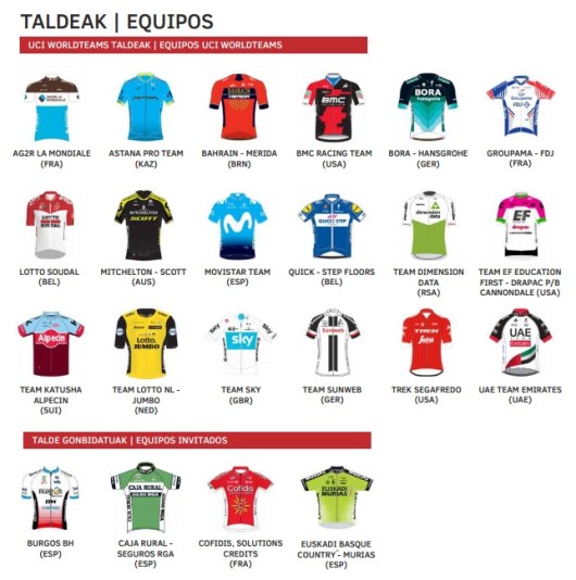 Como es habitual en la Itzulia, la lista de participantes tiene un gran nivel, sobre todo en lo relativo a vueltómanos y corredores que están preparando las clásicas de las Árdenas (varios de ellos habiendo estado en Flandes), si bien curiosamente con la ausencia de los 3 últimos ganadores: Alejandro Valverde, Alberto Contador y Joaquím Rodríguez, estos 2 últimos ya retirados del ciclismo profesional. En total, serán de la partida 22 equipos, los 18 de categoría World Tour y 4 Continentales Profesionales (incluídos los 3 españoles), completando un pelotón de 154 corredores.