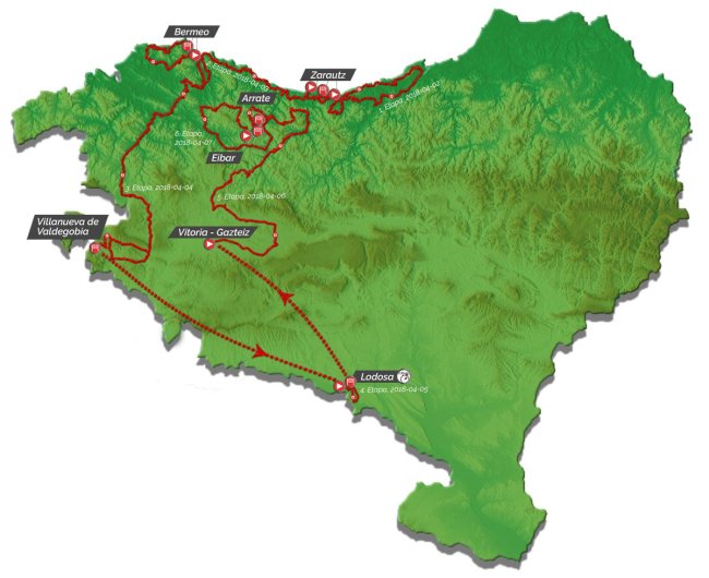 La edición de este año parte desde la localidad costera de Zarautz, en Guipúzkoa, con una etapa de media montaña que consiste en diversos bucles en torno a esta población, el 1º de ellos y más largo incluyendo los puertos de Jaizkibel, famoso por la Klasikoa, aunque afrontado en sentido contrario, y Maddiola, que en realidad es la subida a Mendizorrotz desde San Sebastián, para ya de vuelta a Zarautz realizar bucles más pequeños con Garate, Aia por Andatza, con varios km al 7%, y el muro de Elkano respectivamente. Este último, con la cima a sólo 7 km de meta, es una encerrona, con 2 km por una pista estrecha que tiene tramos hormigonados y rampas extremas, con puntas del 25%, si bien el descansillo central baja la media al 11,5%. En cualquier caso, una subida rompedora y que marcará las primeras diferencias. La 2ª jornada, entre Zarautz y la localidad vizcaína de Bermeo, tiene características similares, con una 1ª mitad junto a la costa incluyendo múltiples repechos y los puertos de Itziar, no puntuado, y Natxitua, con 2,5 km al 8%, para tras un primer paso por Bermeo subir Sollube por Almike, vertiente inédita con 3 km iniciales a casi el 11% (incluyendo 1500 m al 14%) y el más modesto Jata, regresando después hacia Bermeo para en los últimos kilómetros afrontar San Pelaio, con cifras totales, 3,5 km al 8%, que no revelan su auténtica dureza, con un km central al 13% y puntas del 23%, entrando al igual que Elkano y Almike en la lista de rampas máximas en carrera, siendo favorable para los escaladores explosivos.