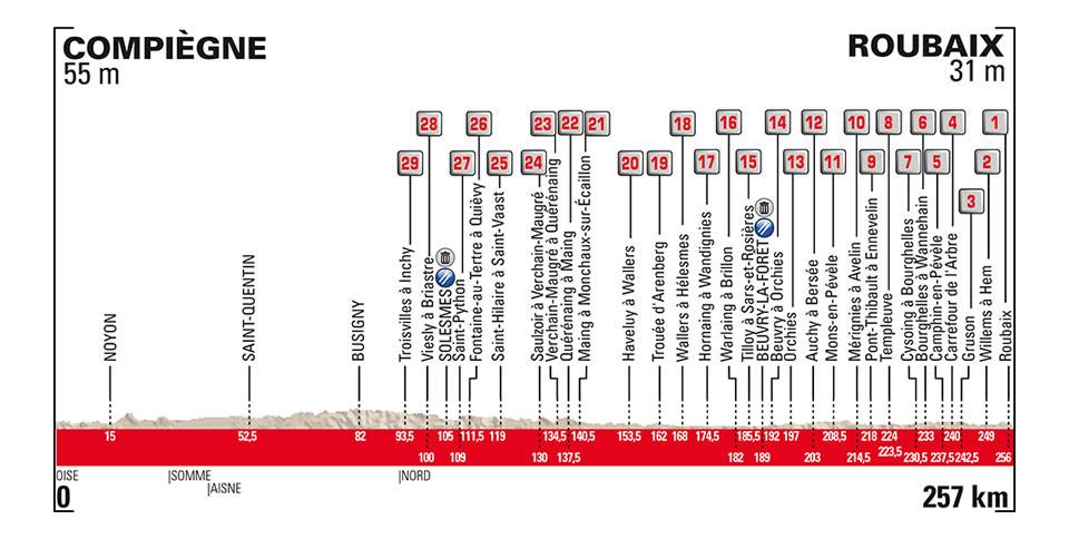 Como viene sucediendo desde 1977, la prueba comenzará en la localidad de Compiégne, en el departamento de Oise, dirigiéndose inicialmente hacia el noreste, con Saint Quentin como población de paso más importante, y sin dificultades reseñables durante los primeros 90 km del recorrido, aunque con probabilidad de lluvia, si bien no está claro. Poco antes del km 95, ya en el departamento de Nord, llegará el primer tramo de pavé, el clásico Troisvilles, siguiendo después con Briastre, Saint Python y Quievy, éste ya de gran exigencia, sobre todo por su longitud, 3,7 km, y realizado en sentido contrario al habitual, antes de la gran novedad de esta edición, el mencionado Saint Vaast. Además de su dificultad concreta, estos primeros sectores de adoquín suelen ser bastante peligrosos debido al riesgo de montoneras, al haber todavía un pelotón muy numeroso.