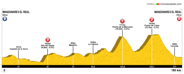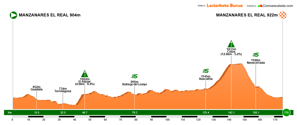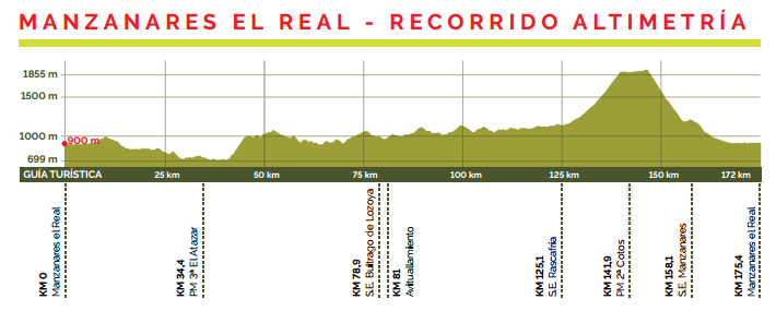 ETAPA 1 (Viernes 4 de mayo): MANZANARES EL REAL – MANZANARES EL REAL (175,4 km). Info en la web / Perfil oficial / Rutómetro / Últimos km / Salida – llegada