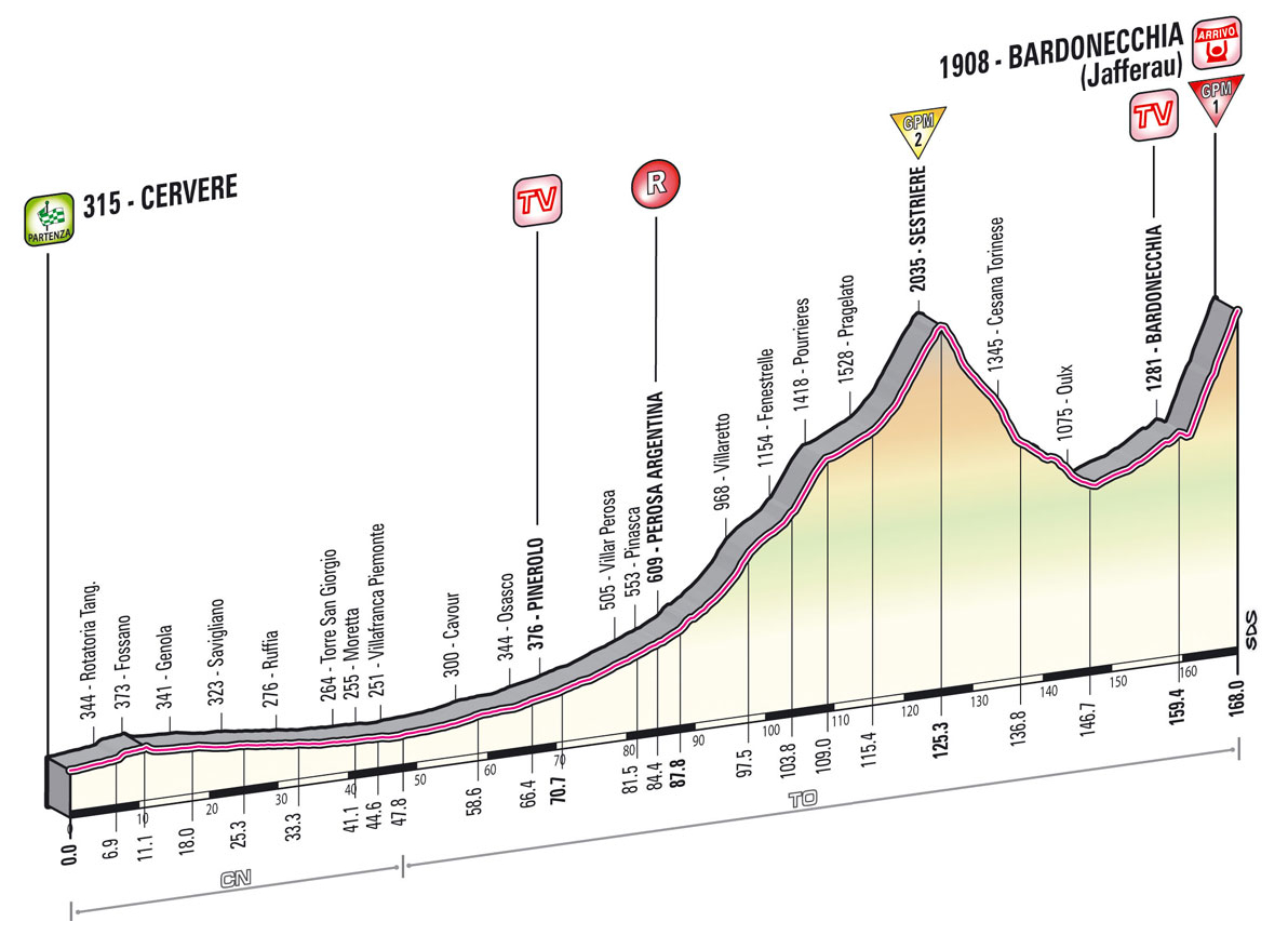 La 19ª etapa, entre Venaria Reale y el Monte Jafferau, es globalmente la más dura de la prueba, con 4600 m de desnivel en 180 km, incluyendo de inicio el irregular Colle del Lys, con un tramo central de 5,6 km a más del 7%, para tras un fuerte descenso hacia el valle de Susa y 30 km llanos afrontar el espectacular Colle Finestre -> fotos, muy constante, teniendo 18,5 km al 9,2% de media, y con últimos 8 km de “sterrato” (en buen estado), siendo además la Cima Coppi de este Giro, con 2178 m. Una vez coronado, rápido descenso hacia Pourrieres y el Colle Sestriere, en general tendido y por buena carretera, aunque con un tramo de 5,5 km al 6,3% cerca de la cima. En otras ediciones ha sido final de etapa, pero en este caso estará a 43 km de meta, con una larga bajada hasta Oulx, aunque excepto el primer tramo muy suave, dando paso a 13 km de falso llano ascendente en busca de Bardonecchia, donde tras rodeo por la localidad se afrontará la subida a Jafferau -> plano, con cifras de 7 km al 9,2% y lo más exigente justo al final -> perfil detallado (hasta cota 1905 m), aunque su propia dureza, unida al terreno entre Sestriere y Bardonecchia, perjudicial para corredores en solitario, puede frenar los ataques lejanos, con los favoritos esperando a Jafferau en lugar de moverse en Finestre. De todos modos, incluso si los corredores desaprovechan el puertos, el desgaste se notará en la subida final.