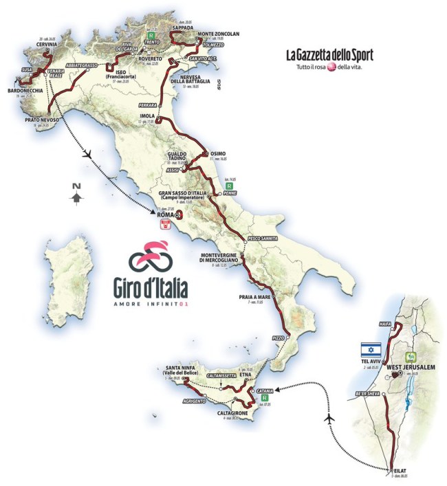 Como decíamos en la entrada previa, este año se cumple la 101ª edición de la prueba, con un sorprendente inicio en la ciudad de Jerusalén, en Israel, el viernes 4 de mayo y final en Roma, la capital de Italia, el domingo 28 del mismo mes, para un total de 21 etapas y 3.563 km, destacando en el apartado montañoso 2 bloques: la dura llegada al Zoncolan seguida por la jornada dolomítica de Sappada, y en los últimos días las etapas de Jafferau, previo paso por Finestre, y Cervinia, con 3 puertos finales encadenados. Además de esta etapas habrá otras 4 llegadas en subidas HC o 1ª, si bien la mayoría en jornadas básicamente unipuerto, aunque con subida finales muy largas, mientras que los rodadores contarán con 2 cronos individuales, pero sumando únicamente 44 km, la cifra más baja desde 2012.