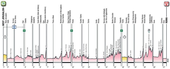 De este modo, la prueba comienza con la mencionada CRI de 10 km en Jerusalén, atravesando la parte oeste de la ciudad con un trazado muy técnico, incluyendo múltiples curvas y repechos, dos de ellos en la parte final, siendo favorable para los corredores «explosivos». Un inicio muy polémico, tanto por la lejanía a Italia, siendo la 1ª vez que una GV comienza fuera de Europa, como por el país y la ciudad escogida, originando protestas, tanto de grupos de derechos humanos como de los propios aficionados … e incluso problemas entre RCS y las autoridades locales, con el gobierno israelí exigiendo que la nomenclatura oficial fuera «Jerusalem» a secas, en lugar de como se mencionó en la presentación y mapa inicial: «West Jerusalem». Volviendo al tema deportivo, al día siguiente de la CRI etapa llana de casi 170 km entre las ciudades de Haifa y Tel Aviv, al noroeste del país, circulando durante gran parte de la ruta en paralelo al mar Mediterráneo. Y como despedida de Israel, en vísperas de la 1ª jornada de descanso, una de las etapas más largas de esta edición, con 230 km entre las localidades de Beerseba y Eilat, junto al mar Rojo, en el extremo sur del país, atravesando el desierto del Néguev, por lo que el viento puede ser un factor clave, haciendo que los favoritos a la general no puedan despistarse, aunque siendo en cualquier caso un día favorable para los velocistas.