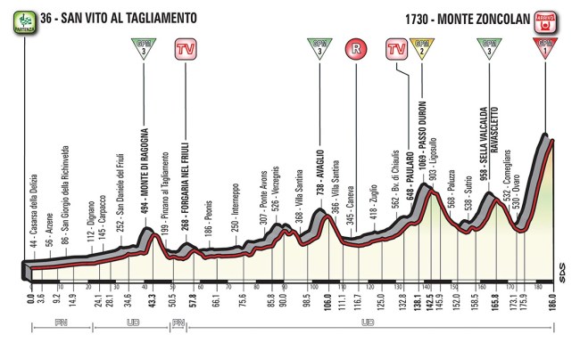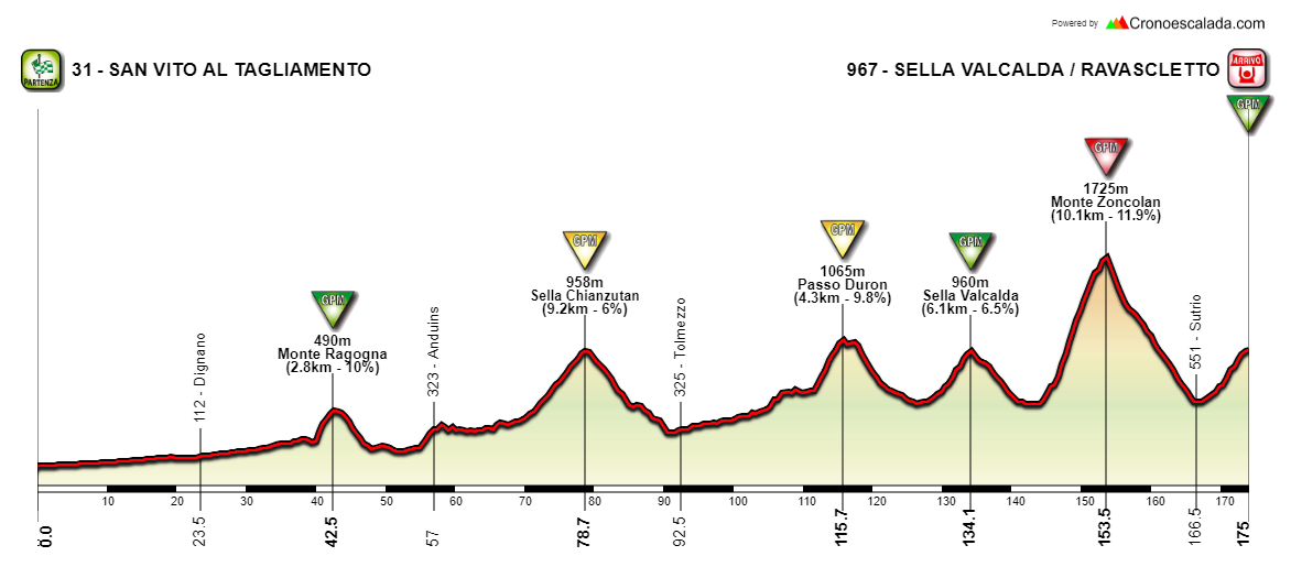 El fin de semana regresa la montaña, con una etapa de 186 km entre San Vito al Tagliamento, en las cercanías de Pordenone, y el temido Monte Zoncolan, en los Alpes Cárnicos, teniendo que superar previamente varias subidas cortas pero muy empinadas, como el Monte Ragogna, con 2,8 km a más del 10% de media; Avaglio que tiene un km y medio central al 13%; Passo Duron, con 4,3 km a casi el 10%, incluyendo rampas del 18%; y tras su revirado descenso y un pequeño rodeo en Sutrio, con repecho incluído, Sella Valcalda, que tiene 3 km centrales al 8,6% de media y cuya bajada llevará a los corredores hasta Comeglians, muy cerca de Ovaro.
