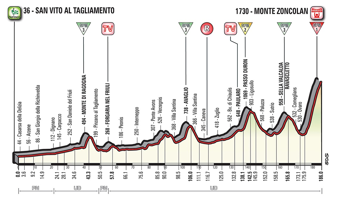 14ª ETAPA (Sábado 19 Mayo):  SAN VITO AL TAGLIAMENTO – MONTE ZONCOLAN  (186 km). Info oficial  / Rutómetro  / Ultimos km / Salida – Llegada