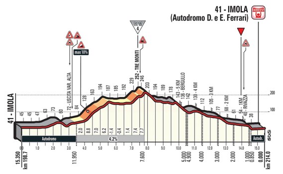 Aunque supera los 200 km, la 12 ª etapa, entre Osimo e Imola, es a priori más sencilla que las jornadas anteriores, con un recorrido en general muy llano, circulando durante la 1ª mitad de la ruta en paralelo al mar Adriático, pero con un bucle final en torno al Autódromo Enzo y Dino Ferrari, donde hubo carreras de Formula 1 hasta 2006, que incluye la cota de Tre Monti, una subida irregular pero que cuenta con 1,5 km iniciales al 7,3%, para tras un llano intermedio acabar con 800 m finales de similar dureza, coronándose a menos de 8 km de la llegada, la mayor parte de suave descenso antes de regresar en el circuito, donde estará la meta -> plano 25 km finales.