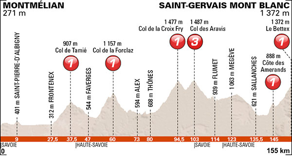 - Col des Saisies, 1ª (km 88,5): 1.663 m – 15,1 km – 6,4 %