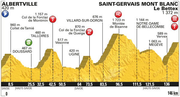 El sábado, turno para un clásico de los últimos años: la «etapa clon del Tour«, con ASO buscando atraer a los favoritos. Más allá de su corta distancia y ser una copia de lo que se verá en julio, tiene un trazado muy interesante, afrontando de inicio Signal de Bisanne, con 12,4 km a más del 8% de media; a mitad de la ruta Col du Pré + Cormet de Roselend, el primero incluyendo un durísimo tramo de 7 km al 9,4% antes de coronar; y tras el largo y peligroso descenso de Roselend, con varias caídas graves en su historial, el decisivo ascenso a La Rosiere, a 8 km de la cima del P. St. Bernard, frontera con Italia. Tanto el inicio como el final son muy tendidos, pero ojo a la zona intermedia, con 6 km centrales al 8,2% pudiendo hacer mucho daño, sobre todo si hay batalla en los puertos previos, como ocurrió en la etapa del Porvenir 2015, con triunfo G.Martin. Y como despedida, otra llegada en una estación de esquí, en este caso Le Bettex, en St. Gervais de Mont Blanc, incluyendo de nuevo Cormet de Roselend, aunque por la vertiente contraria, y Col de Saisies, con 15 km al 6,4%, antes del paso por Megeve y la bajada de Domancy (la cota del Mundial de Sallanches), que precede al muro de Amerands, con casi 3 km al 11%, y la subida final a Le Bettex, con 7 km al 7,7%, destacando los últimos 4 km, al 8,5%. Los antecedentes de esta llegada son muy recientes, con victoria de Froome en 2015 y de Bardet en la etapa del Tour 2016, este último atacando en el descenso de Megeve-Domancy, donde hubo varias caídas por la lluvia, incluído el líder.