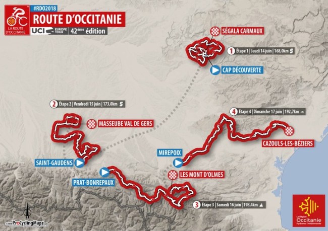 Del 14 al 17 de junio, coincidiendo con las etapas finales de la Vuelta a Suiza, se disputa la 42ª edición de la «Route d’Occitanie«, carrera de la categoría 2.1 que tiene lugar en la región francesa de Midi-Pyrénées, al sur del país, este año con la principal novedad del cambio de nombre, ya que hasta 2017 era la “Route du Sud”, manteniendo en cualquier caso un recorrido atractivo, sobre todo la exigente etapa reina, con 4 puertos de paso y recuperando la llegada en Monts d’Olmes, y la retransmisión en directo por televisión, a través de Eurosport.
