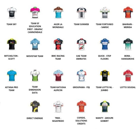 En total, son de la partida 22 equipos, los 18 World Tour, entre los que en principio sobresale el potencial de Sky y Movistar, con múltiples bazas para la general, y 4 Continentales Profesionales (Cofidis, Direct Energie, Fortuneo Samsic y Wanty Gobert), completando un pelotón de 176 corredores, más pequeño que el de años anteriores debido a la reducción de un corredor por equipo.