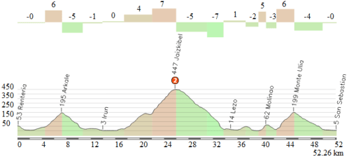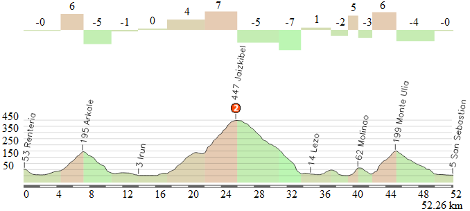 A partir de ahí, un largo tramo sin cotas puntuables pero con varios repechos, destacando Astigarraga, donde estará el avituallamiento, y Gurutze, antes de afrontar el doble paso por Jaizkibel, subiéndose por la vertiente que comienza en los alrededores de Lezo, con 3,2 km iniciales al 7,5 % seguidos por casi un km llano (e incluso con una pequeña bajada) y un tramo de nuevo exigente, con 2 km al 7% de media, suavizando mucho en la parte final -> perfil detallado, con una zona prácticamente llana hasta alcanzar la cima, a 455 m de altitud.