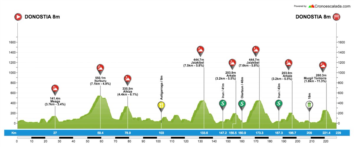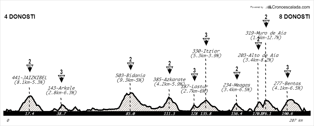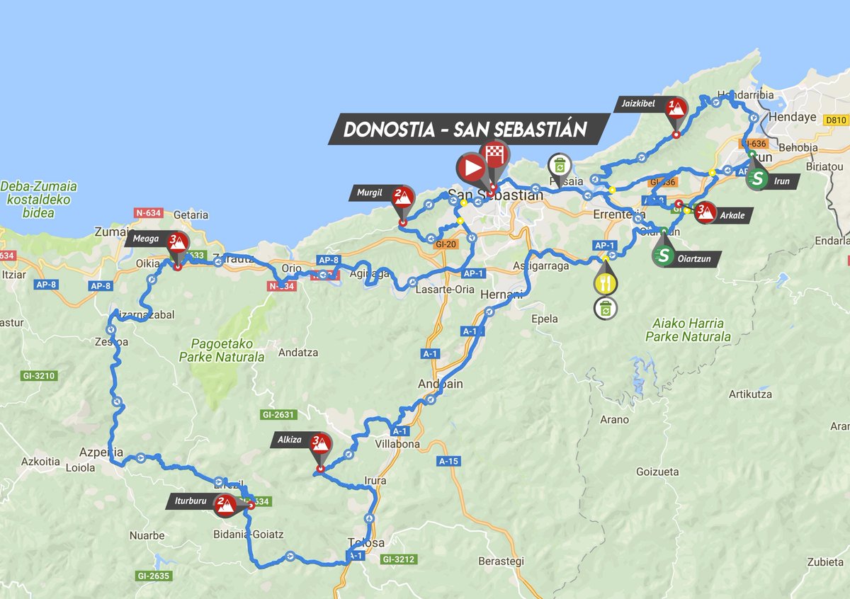 Como decíamos al inicio, el trazado de este año es idéntico al de 2017 (aunque oficialmente tiene 3 km menos), incluyendo 8 subidas puntuables, con los dobles pasos por Jaizkibel y Arkale precediendo al corto pero duro ascenso final a Murgil Bidea / Tontorra, que al igual que en las 2 ediciones anteriores será el punto clave de la ruta.