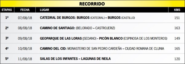 3ª ETAPA (Jueves 9 de agosto): GEOPARQUE DE LAS LORAS (Sedano) – PICÓN BLANCO (149 km). Rutómetro / Últimos km / Salida – Llegada