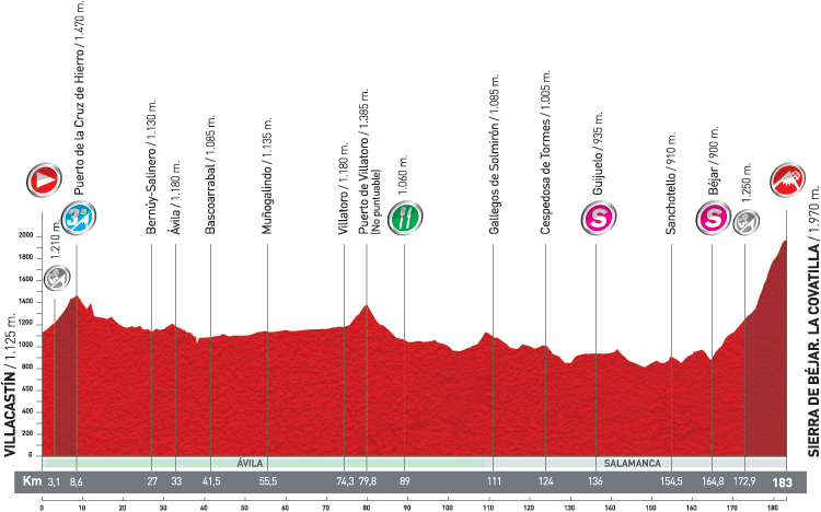 La 8ª etapa, con 195 km entre Linares, la 2ª ciudad más poblada de Jaén, y Almadén, al oeste de Ciudad Real, tendrá un perfil básicamente llano, aunque con la subida a Españares, en el P.N. de la Sierra de Cardeña y Montoro, a mitad de la ruta, además de unos km finales picando hacia arriba, con los 2 últimos al 4-5% -> perfil y mapa interactivo. Un día para los velocistas, mientras que para los favoritos a la general jornada a priori de transición, teniendo que afrontar al día siguiente una etapa clave, con 200 km entre Talavera de la Reina y la estación de esquí La Covatilla, al sur de Salamanca, incluyendo en la 1ª mitad de la ruta un interesante paso por la Sierra de Gredos, en Ávila, con el encadenado de Puerto del Pico -> perfil y fotos, con 15 km al 5,7%, Pdor. de GredosPeña Negra, aunque por vertiente suave, con 12,6 km al 4,6%. Sin embargo, tras el descenso a Piedrahita habrá unos 60 km sin grandes dificultades, aunque con algunos repechos hasta llegar a Béjar, inicio del exigente ascenso a La Covatilla -> perfil y fotos, si bien este año el primer tramo se hará por Candelario (hasta el km 4,3, después la ruta es distinta), cruzando este bonito pueblo por calles empedradas y estrechas, y Navacarros -> últimos 50 km. De todos modos, lo más duro llega pasada la localidad de La Hoya, donde tras abandonar la carretera del puerto homónimo hay un tramo de 4 km al 10%, seguido por una zona muy irregular hasta la cima, con descansillos y rampones intercalados. En total, más de 1000 m de desnivel, con los últimos 8 km al 8,1% de media, haciendo mucho daño si hay buen ritmo, aunque el viento puede perjudicar los ataques, siendo una zona muy expuesta.