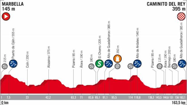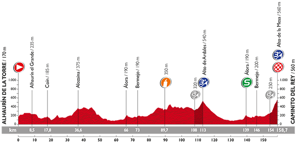 Así pues, la carrera empezará con una crono individual en ciudad de Málaga, con salida desde Centro Pompidou y meta en Marqués de Larios tras 8 km de recorrido, incluyendo un repecho de 1 km al 5,5%, que debido a la escala apenas se aprecia en el gráfico oficial, y varias curvas cerradas -> perfil detallado, siendo en ese sentido una contrarreloj para ciclistas explosivos, aunque habría sido interesante un kilometraje algo superior. Al día siguiente, etapa quebrada, con 164 km entre Marbella y el Puerto de las Atalayas (oficialmente Alto de Guadalhorce), junto al centro de visitantes de Caminito del Rey, en el desfiladero de los Gaitanes. De inicio, los corredores afrontarán el Puerto de Ojén, yendo hacia el norte en busca de un primer paso por la línea de meta, realizando a partir de ahí un largo circuito, de 72 km, que incluye el Alto de Ardales antes de una zona de falsos llanos previa a la subida final, con menos de 5 km al 4% pero por una vía estrecha, aunque en perfectas condiciones, y con un último km al 6,5% propicio para los «up-hill finishers». Aclarar que esta subida es diferente a la anunciada en la presentación y vista en 2015: el Alto de Mesas de Villaverde (hasta cota 580 m), con casi 4 km finales a más del 8% de media y puntas del 15%, con triunfo y liderato para Esteban Chaves -> clasificación / vídeo, habiéndose cambiado en la ruta definitiva de este año sin ninguna explicación, aunque probablemente sea para rebajar dureza en los primeros días.