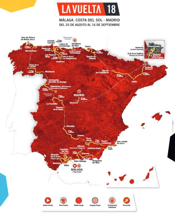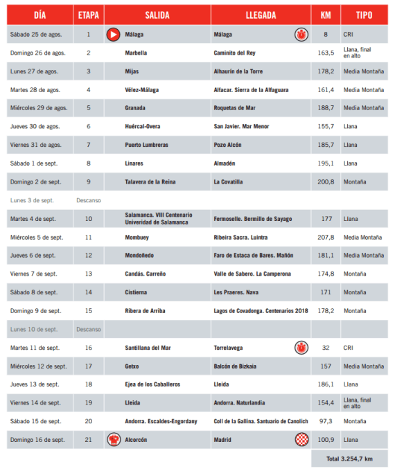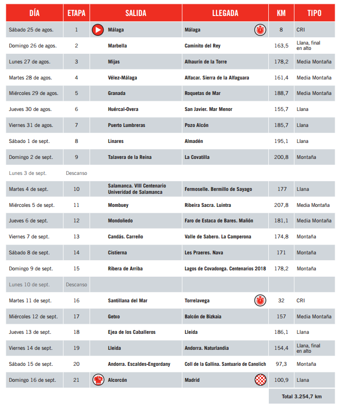 Como decíamos en la entrada previa, este año se disputa la 73ª edición de la prueba, que con inicio en Málaga el 25 de agosto recorrerá Andalucía durante los primeros días, destacando la etapa de Alfacar, pasando después por Murcia y Castilla la Mancha antes de dirigirse a Castilla y León, con final incluido en La Covatilla, y el norte peninsular, con protagonismo a mitad de carrera para Galicia y sobre todo Asturias, con llegadas en Les Praeres y Lagos de Covadonga, para ya en la última semana afrontar una CRI en Cantabria y el ascenso al Monte Oiz en País Vasco, antes del paso por Cataluña y el “fin de fiesta” en Andorra, con posterior traslado hasta Madrid para acabar la prueba el 16 de septiembre. En total, 3.271 km divididos en 21 etapas, con los habituales 2 días de descanso intercalados.