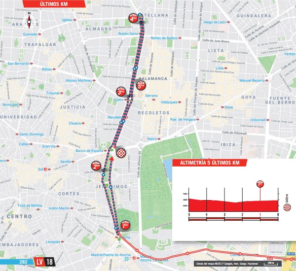Más allá de ese tema, y aunque a la hora de verdad puede resultar muy entretenida, el diseño de la etapa y en general del bloque andorrano es decepcionante, ya que no han incluído como tal ninguno de los grandes puertos de paso de la zona: Gallina, Envalira y Rabassa, utilizándolos como llegada (en el caso del primero con la subida «capada») o esquivándolos, realizando en su lugar dobles pasos por Beixalis, duro pero relativamente corto, y la Comella. Y no hacía falta una gran imaginación: bastaba con subir Gallina entero antes del ascenso final. Otra opción sería una ruta similar a 2015 -> clasificación / vídeo, que incluía el duro ascenso a la Gallina por Fontaneda y terminaba en Els Cortals, donde se impuso Landa, aunque en este caso, siendo la última de montaña y para no condicionar las etapas previas, mejor un final en alto más blando o acabar tras descenso, por ejemplo en Andorra la Vella, como en 2017. De todos modos, lo que si habrá seguro después de la etapa es un enorme traslado hasta Madrid, acabando la prueba con la clásica etapa llana en la capital, corta pero con múltiples pasos por meta (12), si bien teniendo un circuito final distinto al de los últimos años debido a las obras en la Gran Vía, aunque la llegada es la misma, en la Plaza de Cibeles y picando hacia arriba. Una jornada para los velocistas, con triunfo de Degenkolb en 2015, Cort Nielsen en 2016 y Trentin en 2017, sirviendo además de homenaje a todos los corredores que hayan completado la prueba.