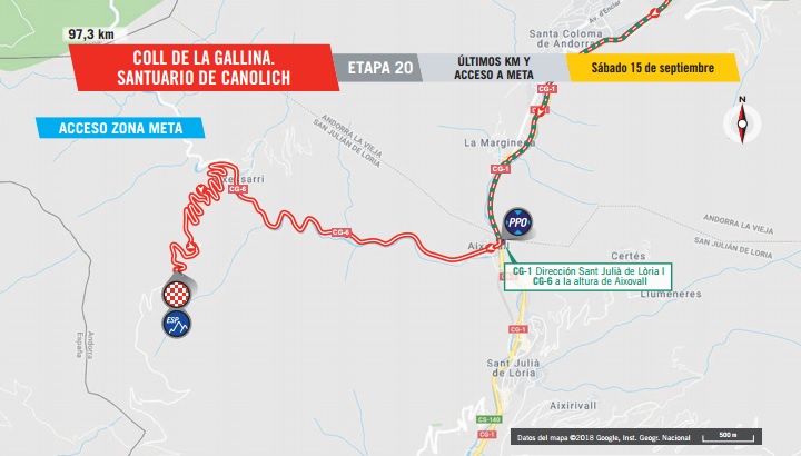 Y como última jornada de montaña, una etapa íntegramente andorrana, de sólo 97 km pero con 3300 m de desnivel acumulado debido al sube y baja constante, incluyendo 6 puertos, aunque varios de ellos repetidos, como La Comella, que se afrontará por vertiente sur (4,3 km a 8%) al inicio de la ruta y por su cara norte, más irregular, en la parte final; y Collada Beixalis, en este caso siempre por la vertiente este, aunque en el primer paso empezando desde más abajo, compartiendo en cualquier caso la parte principal de la subida, con 2,5 km centrales al 11%. Y ojo también al descenso, revirado y por ctra. estrecha, aunque en buenas condiciones. El otro puerto de paso de la jornada, entremedias de las subidas a Beixalis, será el Col de Ordino, con 10 km muy constantes al 7%. Y para terminar la etapa, el duro ascenso al Santuario de Canolich, situado en plena subida al Col de la Gallina (cota 1550 m), que con 4 km finales al 9-10% puede resultar decisivo para el podio final, aunque en el lado negativo también podría condicionar el desarrollo de la etapa. Señalar que las 2 llegadas previas en Canolich fueron en el año 2012 -> clasificación / vídeo, ganando Valverde seguido por Purito y Contador; 2013 -> clasificación / vídeo, imponiéndose Ratto tras una escapada, con Nibali y Horner como los más fuertes de los favoritos, en un día marcado por el frío y la lluvia, notándose sobre todo en Envalira, con la cima a 2400 m, y Ordino, habiendo varias retiradas y caídas. Por otro lado, no está claro si el final será el mismo o acabarán en cota 1480 m: según perfil y rutómetro sería esto último, pero en el plano del final sí repiten la llegada de esas etapas, lo que tiene más sentido, ya que es el único sitio con espacio suficiente para la meta.