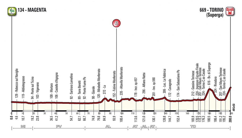 No obstante, será a partir del km 175, después de la travesía junto a la ciudad, cuando comience la parte decisiva, con el inicio de la 1ª ascensión al Colle di Superga, con unas cifras de 4,3 km al 9,1% de media, incluyendo largos tramos por encima del 10% y puntas del 14%. Al llegar al cruce de la cota 616 m, en lugar de desviarse hacia el sur, como en 2014 y ediciones previas, se seguirá dirección oeste y después norte en busca de Rivodora y San Mauro Torinese, afrontando un descenso con zona intermedia de mucha pendiente y trazado revirado, aunque por buena carretera.