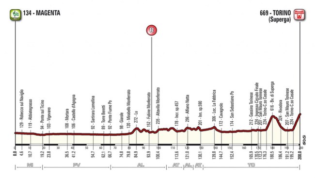 De este modo, la prueba comenzará en la mencionada localidad de Magenta, con una población de casi 25.000 habitantes y situada en las cercanías de la capital lombarda, dirigiéndose primero hacia el sur y luego hacia el oeste, atravesando la llanura del Po, en busca de las provincias de Alessandria y Asti, donde los corredores tendrán que afrontar un largo tramo rompepiernas de unos 60 km, destacando las cotas de Lu y Alfiano Natta, aunque al paso por Cavagnolo, ya en la provincia de Torino, volverá el terreno llano.