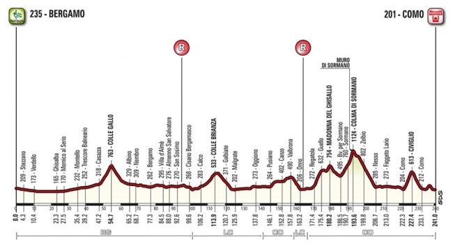 Como decíamos al inicio, el recorrido de este año es muy similar a los de 2015 y 2017, repitiendo las localidades de salida y llegada, Bérgamo y Como respectivamente, así como casi todos los puertos, subiéndose además por la misma vertiente, destacando los míticos Madonna del Ghisallo y Muro de Sormano antes de ascenso a Civiglio, si bien cambiando la última cota, afrontándose Monte Olimpino en lugar de San Fermo debido a las obras en la carretera de este último, para una distancia total de 241 km.