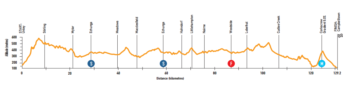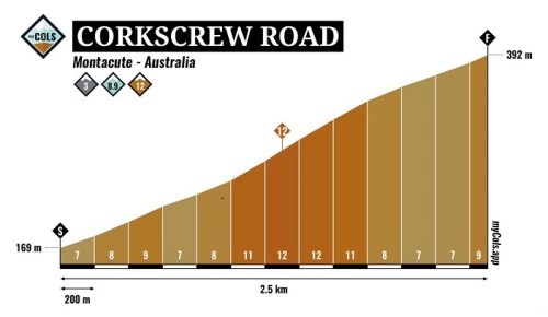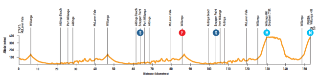 - Old Willunga Hill, 1ª (km 129,1 / Meta): 3 km – 7,5 %