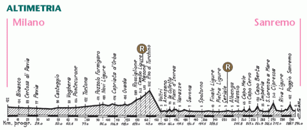 De hecho, durante muchos años la única subida reseñable fue el Passo del Turchino, que afrontado por el norte no pasa de ser un 3ª, colocado además muy lejos de meta. Pero a medida que la carrera fue resultando cada menos selectiva la organización fue endureciendo la ruta para evitar que grandes pelotones se jugaran la victoria al sprint, añadiendo diversas cotas. De este modo, en 1960 incluyeron el Poggio, una subida sin mayor dificultad (3,7 km al 3,7 %) pero cuya cercanía a la llegada y el hecho de que se afronte con muchos km en las piernas la convierten en decisiva, teniendo además un descenso bastante técnico. En 1982 le llegó el turno a la Cipressa, una cota algo más exigente (5,6 km al 4,1%) aunque situada a mayor distancia de meta. Desde esa edición el recorrido se mantuvo prácticamente inalterable durante más de 25 años.