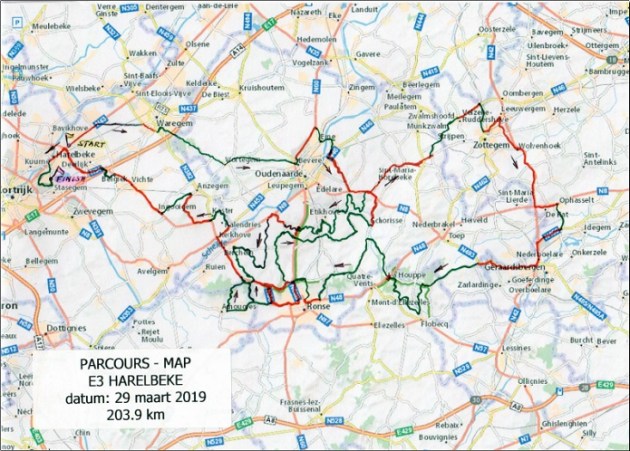 Como la gran mayoría de clásicas flamencas, el trazado de la prueba está marcada por los “muros”, subidas cortas pero con fuertes rampas, llegando incluso al 20%, y tramos de pavé, lo que además de convertirla en una carrera muy exigente y casi siempre espectacular hacen que sea un gran test de cara al Tour de Flandes, Ronde Van Vlaanderen, y también, aunque en menor medida, como preparación para la Paris-Roubaix. De hecho, gran parte de las cotas que se superan en “De Ronde” son también subidas habituales en Harelbeke, algunas con similar protagonismo … si bien con una diferencia importante: el kilometraje total, siendo bastante más corto en la E3, con normalmente unos 50 km menos que el Tour de Flandes, aunque la cifra exacta varía todos los años.