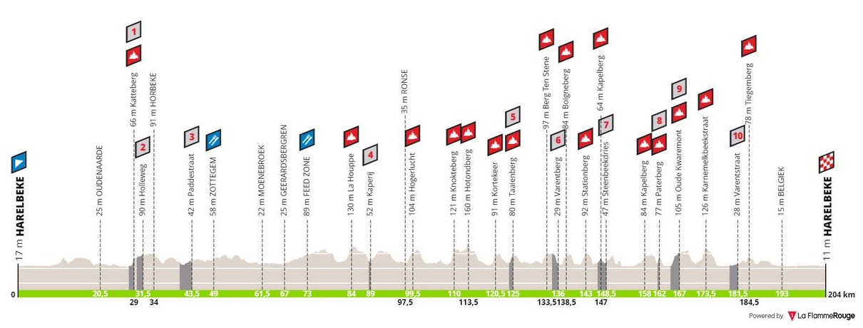 Aunque el desarrollo de la carrera es imprevisible, pudiendo pasar cosas importantes en cualquier instante, ya sea por ataques lejanos, como en el propio 2018, aprovechando la estupenda sucesión de cotas, o caídas, que ya han marcado varias ediciones, a priori el momento clave llegará en los 50 km finales, con el Kapelberg, de 1,3 km al 7% y máximas del 14% (aunque según el rutómetro sería bastante más blando), justo antes del encadenado de Paterberg -> imágenes, y Oude Kwaremont -> imágenes: el 1º de ellos “corto pero matón”, con 360 m a más del 12% de media y puntas que llegan al 20%, formando parte de la lista de rampas máximas en carrera; y el viejo Kwaremont, más tendido pero mucho más largo, con 2,2 km al 4,2% y máximas del 11%. Estos 2 muros, ambos de pavé, son también las ascensiones claves del Tour de Flandes desde el cambio de recorrido de 2012, aunque colocados en el orden inverso, con Kwaremont situado delante del Pateberg.