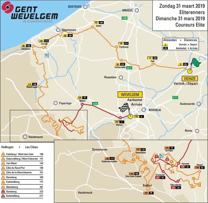 El recorrido de este año es muy similar a las últimas ediciones, con el único cambio reseñable respecto al año pasado de la eliminación del muro de Ravensberg, repitiendo todas las demás cotas y en el mismo orden, así como los mencionados “Plugstreets“, 3 tramos de tierra seguidos en torno al km 195 de la ruta, sumando en total 4 km sobre esta superficie -> vídeo presentación / reconocimiento de los tramos. Aunque los 3 están en buen estado, su estrechez puede provocar cortes en el grupo, especialmente si sopla viento de costado, al ser caminos muy expuestos.