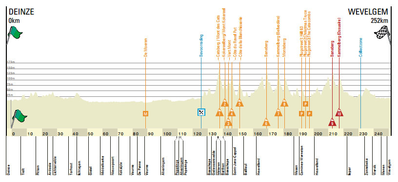 Superados los Plugstreets, ya en los 55 km finales de la prueba, habrá una zona llana antes de afrontar las dos últimas subidas: Baneberg, con 300 m finales al 9-10%, y justo a continuación la vertiente más dura del Kemmelberg (antes se habrá subido por otra vertiente distinta, también con pavé), que incluyendo 500 m finales a casi el 12% de media -> perfil detallado, y la superficie adoquinada puede destrozar el pelotón a poco que el ritmo sea elevado, como de hecho ya ocurrió en 2 de las 3 últimas ediciones.