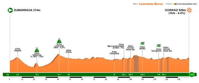 2ª ETAPA (Martes 9 Abril): ZUMARRAGA – GORRAIZ (149,5 km). Info en la web, incluye rutómetro