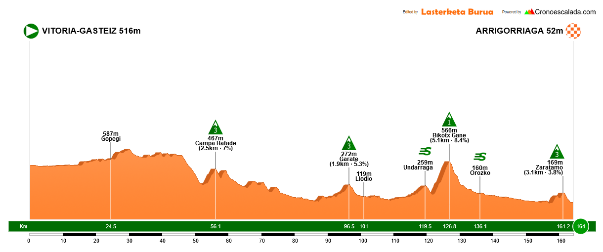 - Alto de Karakate, 1ª (km 80,8): 552 m – 5,2 km – 8,5 %