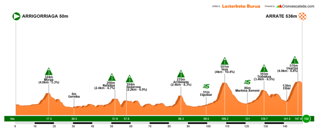 5ª ETAPA (Viernes 12 Abril): ARRIGORRIAGA – ARRATE (149,8 km). Info en la web, incluye rutómetro
