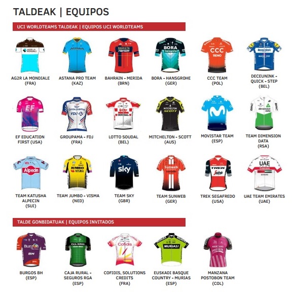 Como casi siempre en la Itzulia, la lista de participantes es a priori estupenda, sobre todo de vueltómanos, destacando Yates, Landa, Izagirre, Thomas, Fuglsang y Mas, y corredores que están preparando las Árdenas, como Alaphilippe, Martin, Kwiatkowski y Schachman, si bien de nuevo con la ausencia de los ganadores anteriores, ya sea por retirada (Contador y «Purito») o voluntaria, como Roglic, que tras un gran inicio de año se está tomando un respiro, y Valverde, que el pasado domingo corrió el Tour de Flandes. En total, serán de la partida 23 equipos, los 18 de categoría World Tour y 5 Continentales Profesionales (incluídos los 3 españoles), completando un pelotón de 161 corredores, 7 más que en la última edición.